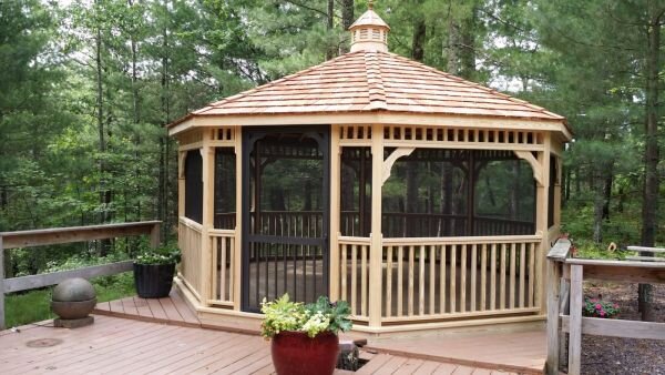 If you have your heart set on a light linen or other transparent fabric, hang a second set of curtains to close when you want more privacy. This easily turns it into a backyard statement piece. The more space between the beams, the more light will get trough the pergola. The spikes were then driven into the ground at the determined positions, ensuring that the columns will be vertical once in place. These full-grown shrubs highlight the front of your gazebo, giving the entrance a natural look. It's recommended that you get help with this next step. Double-check the supports are vertical and in line with each other and that the rafter is level.
